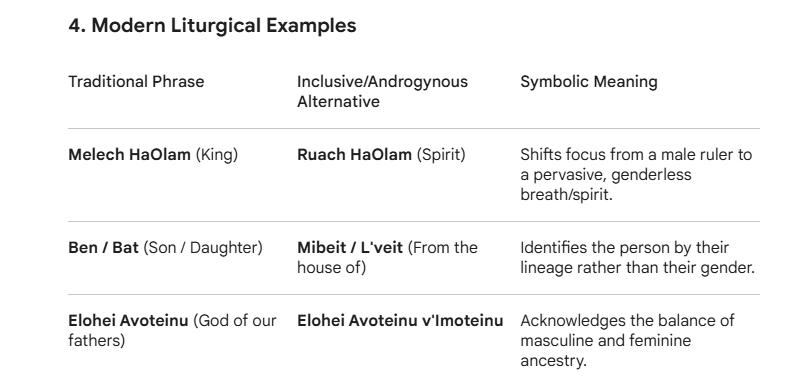 In recent decades, Jewish liturgy has evolved to better reflect the "androgynous" or non-binary nature of the soul. This is often seen as a return to the mystical idea that the soul (Neshamah) is a spark of the Divine and therefore transcends physical gender.