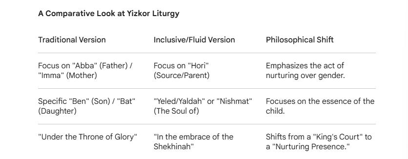 The "Androgynos" Inclusion: In some Sephardic and contemporary Ashkenazi rituals, a specific line is added to remember "those who lived between categories," ensuring that individuals who were androgynous or non-binary in life are named and honored accurately.