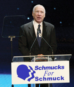 "We must save this word!" Brooks said to thunderous applause as those in attendance began chanting "Schmuck! Schmuck! Schmuck!" "How will we be able to charmingly describe someone who acts in an inappropriate manner? Especially given the tragic loss of the word 'schmegeggie' in 2001. So I urge you: Tonight, when you get home, please, call up your family, your friends, your loved ones, and tell them they're a bunch of schmucks."